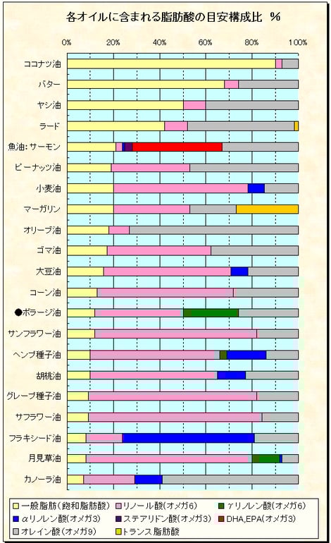 ボラージオイルには月見草油の約2倍の25%のγーリノレン酸がふくまれており、非常に効率よく摂取することができるオイルです。